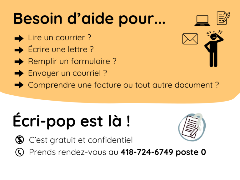 Écri-pop est un service d’écrivain public. Tu peux venir avec un formulaire que tu trouves compliqué. On va t’aider à le comprendre et le remplir. Tu peux venir avec une facture que tu ne comprends pas. On va la lire avec toi. Tu peux venir pour avoir de l’aide pour envoyer des courriels à tes proches ou encore pour écrire une lettre.